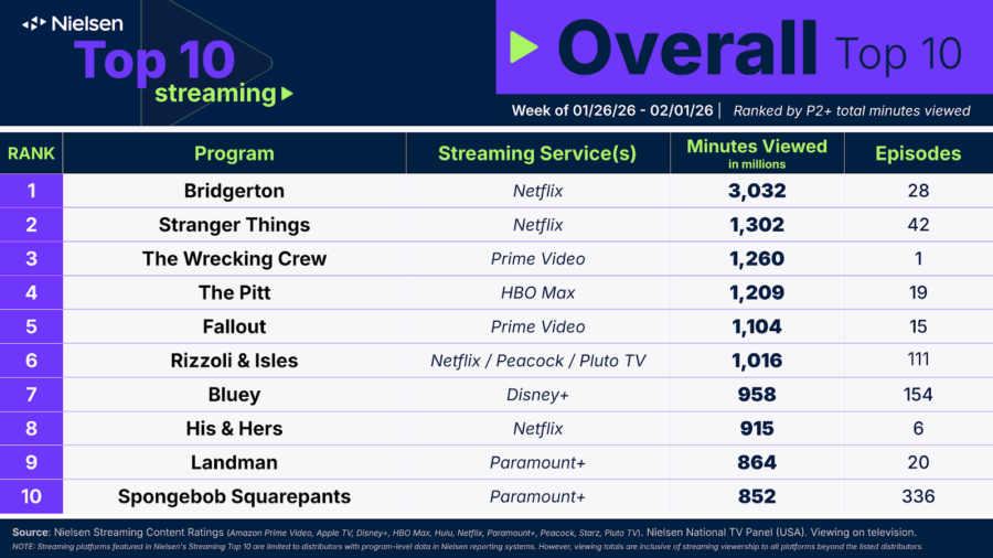 Prime Video owned three titles on the charts this interval. The action-comedy film The Wrecking Crew topped the movie chart with 1.26 billion minutes and placed No. 3 overall. The original series “Fallout” trailed at No. 5 overall with 1.1 billion minutes (No. 4 original), having added the penultimate episode of its second season Jan. 27. The sci-fi series consistently draws the largest share of 18-49 year-old viewers among top 10 originals, representing 61% of its audience for the week.