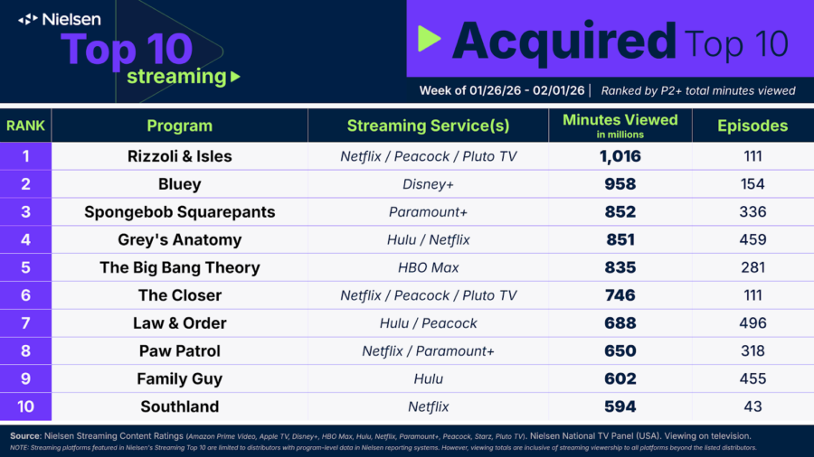 The catalog cop drama “Rizzoli & Isles” generated 1.02 billion minutes to top the acquired chart (No. 6 overall) as the series continues to reap the benefits of streaming on Netflix.