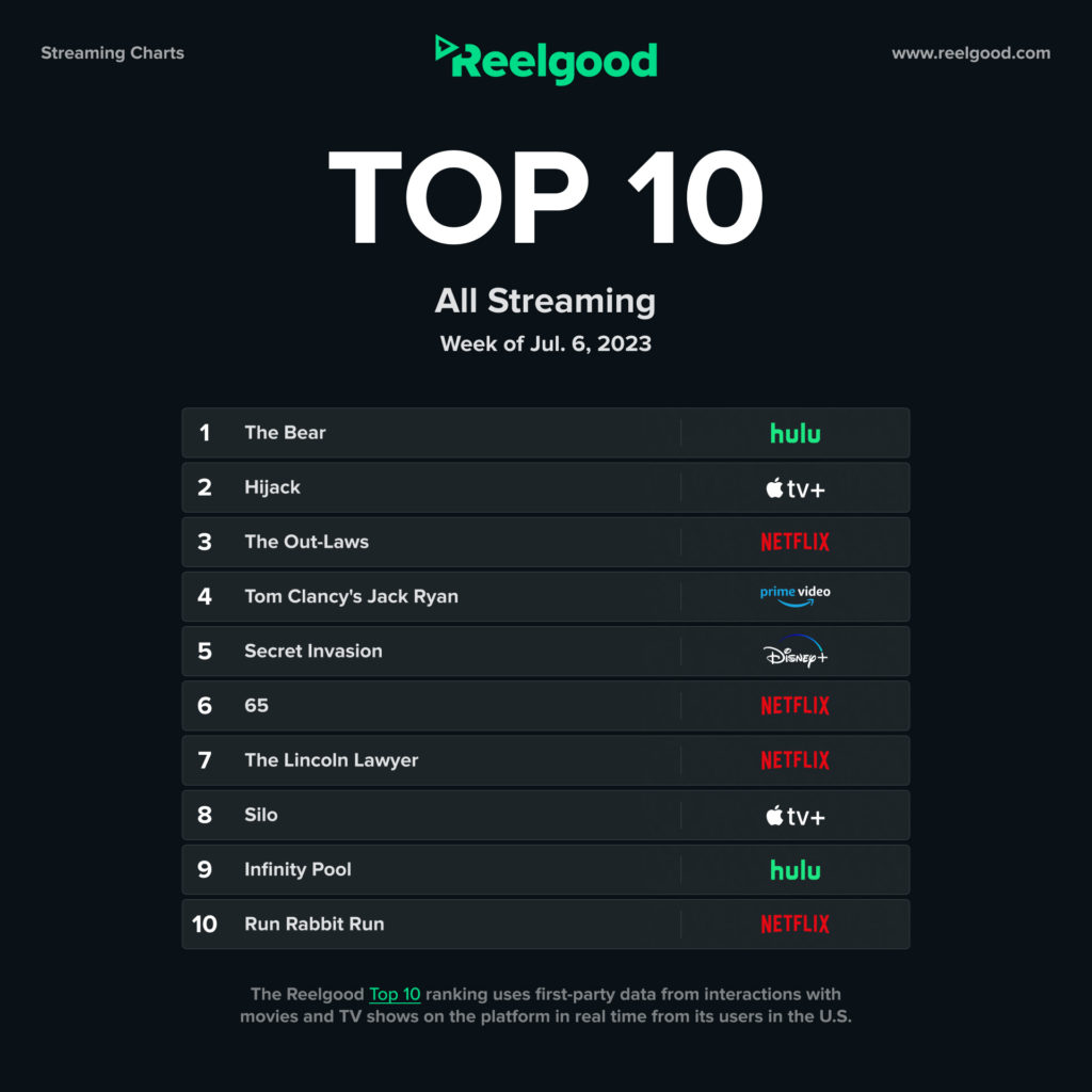The second season of Hulu’s award-winning family diner drama “The Bear” remained the most-streamed weekly content through July 12, according to new data from Reelgood, which tracks real-time data from 5 million users in the U.S. across SVOD and AVOD services for original and acquired streaming programs and movies.