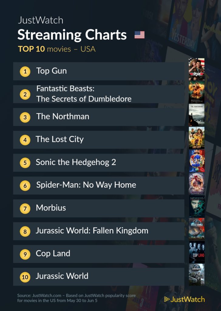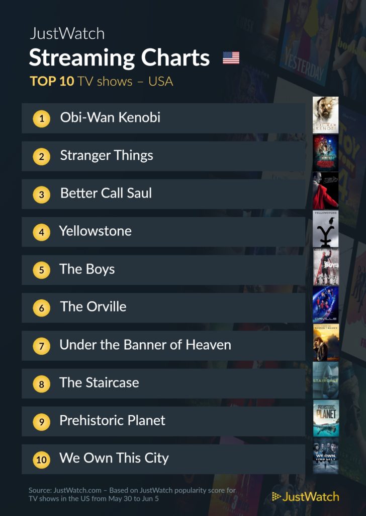 Paramount Pictures’ original 1986 movie Top Gun was the most-streamed feature film through June 5, according to new data from JustWatch, which tracks more than 20 million users’ monthly streaming choices across 54 countries. New Disney+ series “Obi-Wan Kenobi” was the most-streamed series.