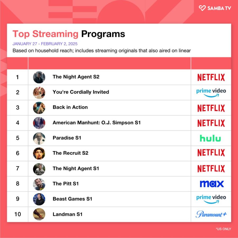 Season two of Netflix’s “The Night Agent” took over the No. 1 on Samba TV’s list of top streaming programs for the week of Jan. 27 to Feb. 2.