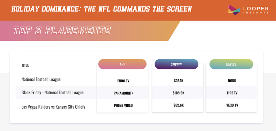 Looper’s analysis shows that the top three NFL promotional placements across Roku, Fire TV and Vizio each achieved the maximum MPV score of 24, ranking them in the top 2% of all U.S. connected-TV promotions during the week.
