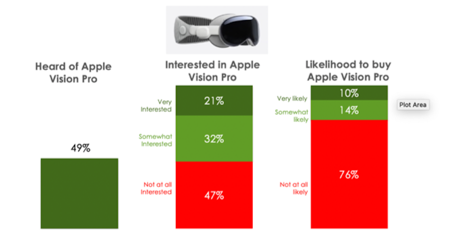 Separately, with a reported 200,000 Apple Vision Pro virtual reality headsets sold upon launch, Apple would appear to have established solid awareness (49%) and interest (53%) for the $3,500 device. However, consumer intent to purchase remains low (10%), with interest in the devices around 21%. Respondents still believe the most popular use case for headsets lies in gaming, and not watching television.