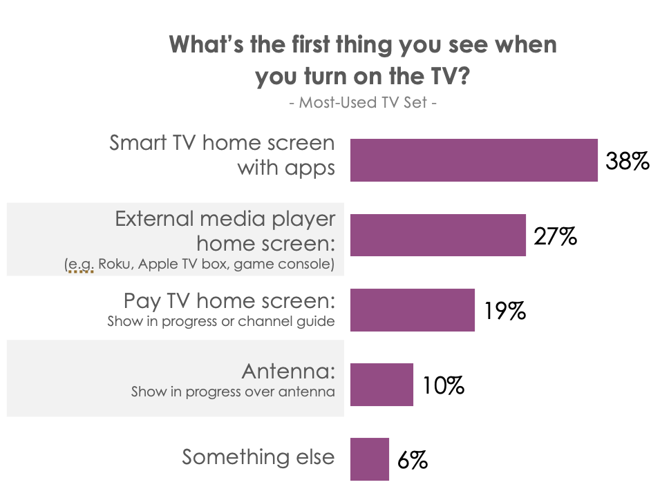 Citing a May survey of 2,517 U.S. consumers ages 16-74, 38% said the first thing they see when they turn on their TV is the apps installed on the home screen of their smart TV. Another 27% said they see the apps on a home screen of an external media player, such as a Roku player. And only 19% see a show in progress from a pay-TV provider. Thus, the discovery process is becoming one driven by apps and smart TV operating systems.