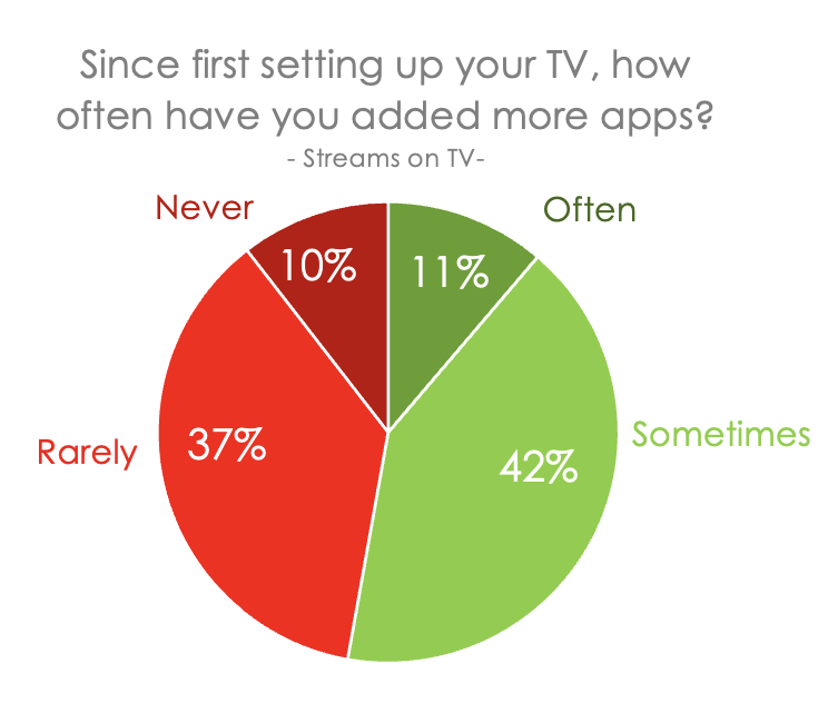 Half (51%) of respondents said that they installed a new TV app recommended by their smart-TV operating system when they set up their TV for the first time. And nearly half (47%) said that once their TV was set up, they rarely or never add more apps.