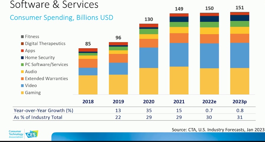 Entertainment hasn’t been in the CES spotlight since the heyday of DVD and Blu-ray Disc, but the rise of streaming — and the growth in ad-supported models — hasn’t gone unnoticed. At the Jan. 4 Tech Trends to Watch presentation, Melissa Harrison, VP of marketing and communications for CES producer the Consumer Technology Association (CTA), called out “the rise of ad-supported streaming” as a primary driver in a projected 4.2% uptick for 2026 in consumer spending on software and services.