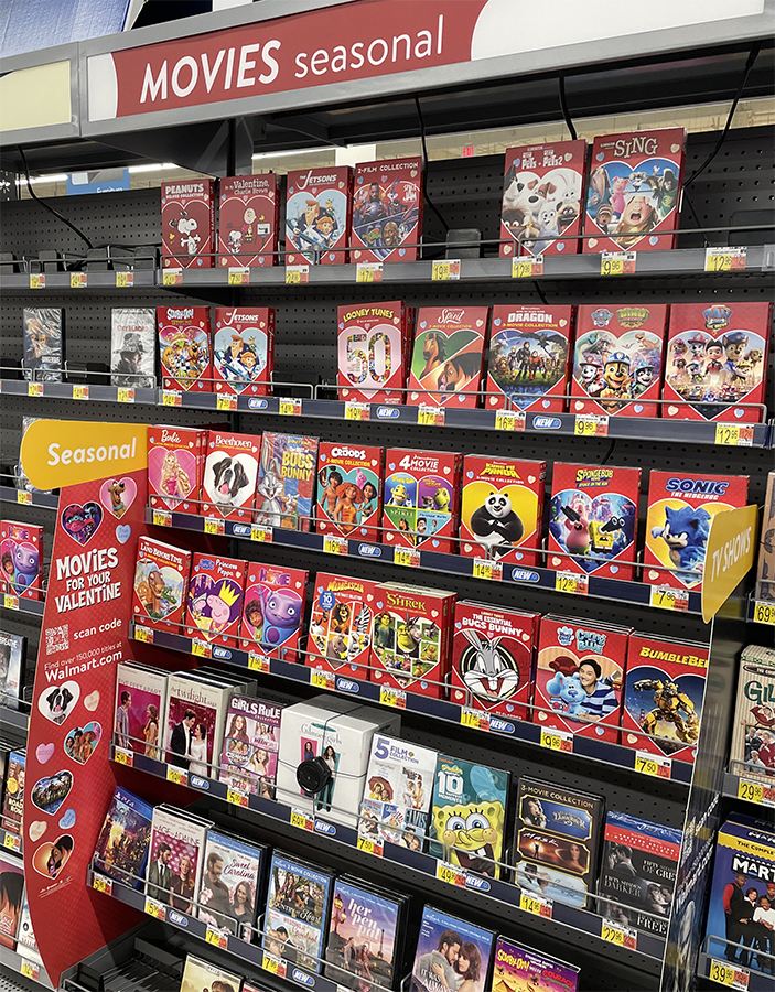 Walmart stores have been setting up Valentine’s Day displays in DVD sections. Dubbed “Movies for Your Valentine,” the section offers catalog DVDs with special promotional slipcovers featuring the box art in a heart design.