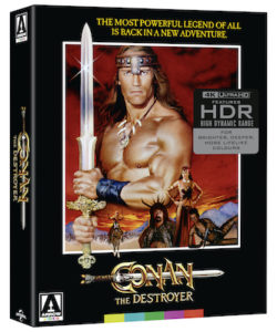 In Conan the Destroyer (1984), the sequel to Conan the Barbarian, Schwarzenegger returns as Robert E. Howard’s sword-wielding antihero. Conan is offered the opportunity to take a young princess (Olivia D’Abo) on a quest to retrieve the jeweled horn of the dreaming god Dagoth. In return, the love of his life Valeria will be brought back to life, though Conan and his fellowship get more than they bargained for as Dagoth may not be the benevolent demigod they expected. Directed by Richard Fleischer, Conan the Destroyer features an international cast that includes supermodel/icon Grace Jones, D’Abo, NBA Hall of Famer Wilt Chamberlain, Tracey Walter, and Sarah Douglas. The Blu-ray and 4K UHD limited-edition sets include a double-sided fold-out poster, six double-sided collectors’ postcards, an illustrated collectors’ booklet featuring new writing by Walter Chaw and John Walsh, and an archive set report by Paul M. Sammon. The release features a new 4K restoration from the original negative, 4K Ultra HD Blu-ray (2160p) presentation in Dolby Vision (HDR10 compatible), and newly restored original mono audio and remixed Dolby Atmos surround audio. Bonus features include archive feature commentary by director Richard Fleischer, actors Olivia d’Abo, Tracey Walter and Sarah Douglas; newly filmed interviews and commentary with cast and crew; theatrical trailers; and an image gallery.