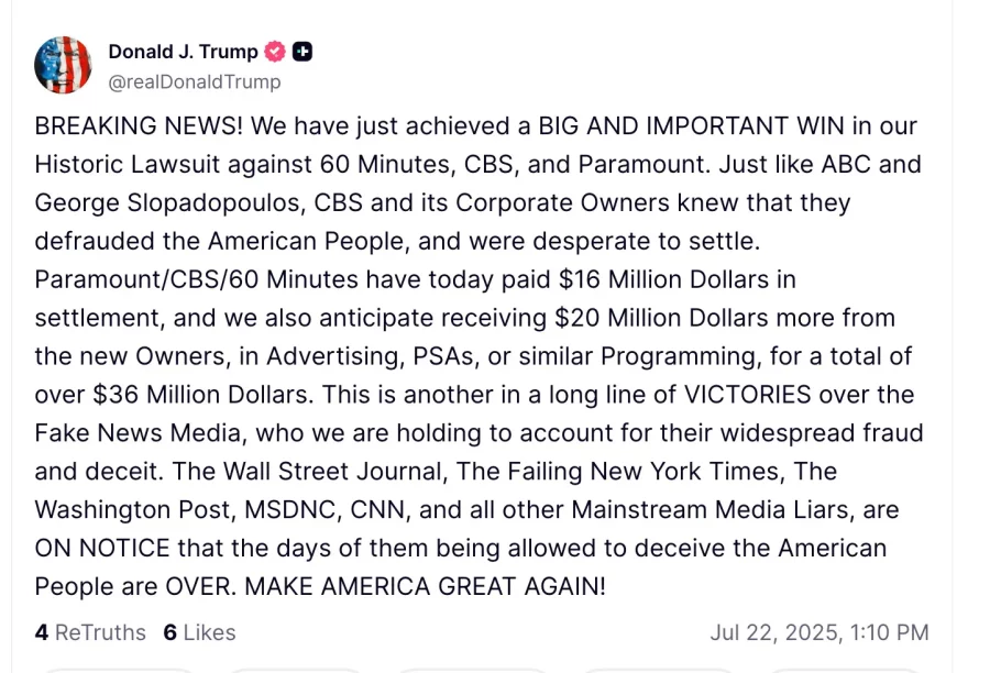 President Trump July 22, in a social media post, claimed he is receiving an additional $20 million from Paramount Global as part of a previously-announced $16 million settlement over allegations of “mental anguish” after a “60 Minutes” interview last October with his Democrat opponent, then-vice president Kamala Harris.
