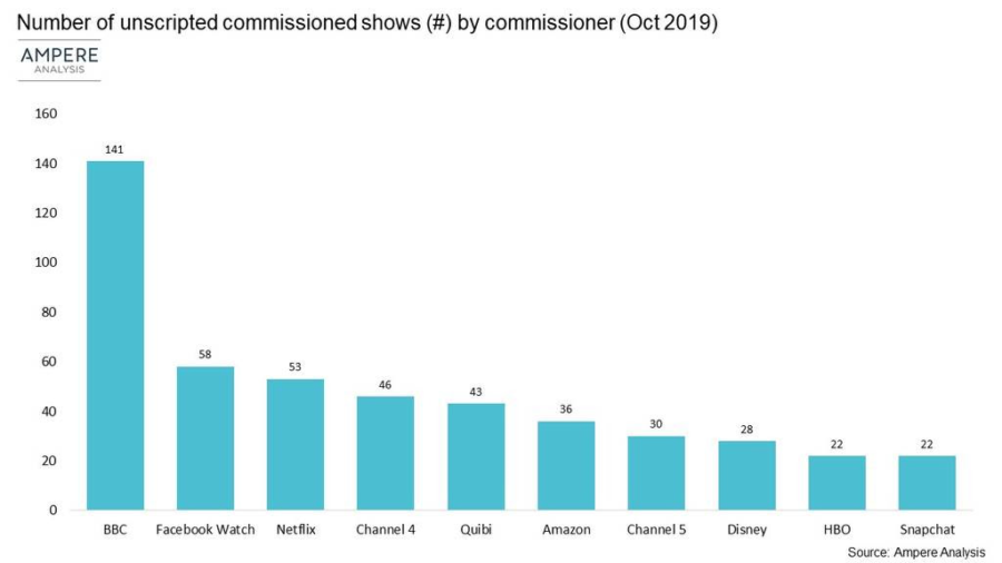 With 58 shows in production, Ampere says Facebook Watch is the second largest commissioner of unscripted content globally after the BBC. Snapchat rivals HBO and National Geographic with 22 commissioned unscripted shows currently in production.