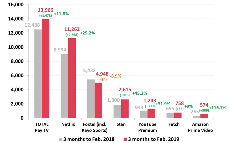 SVOD services YouTube Premium (formerly YouTube Red), Fetch and Amazon Prime Video also saw significant sub increases.