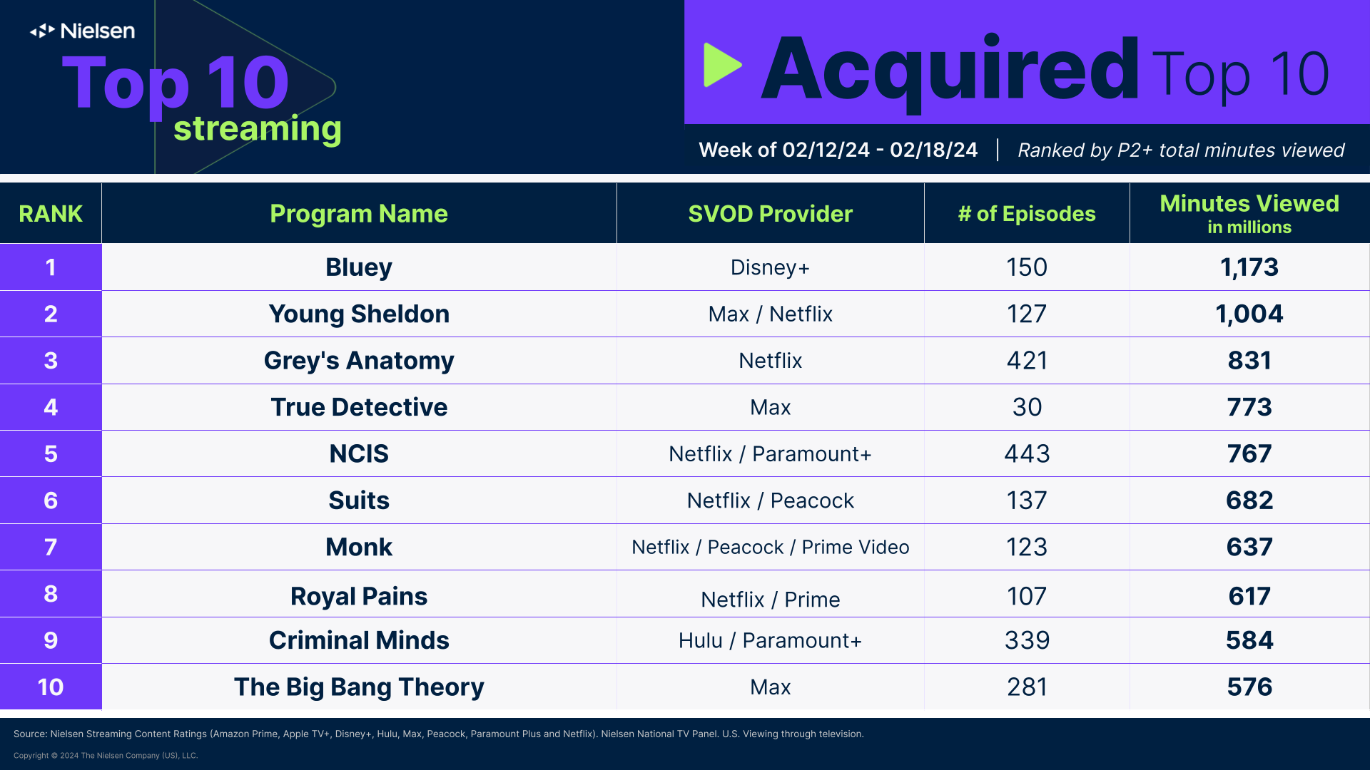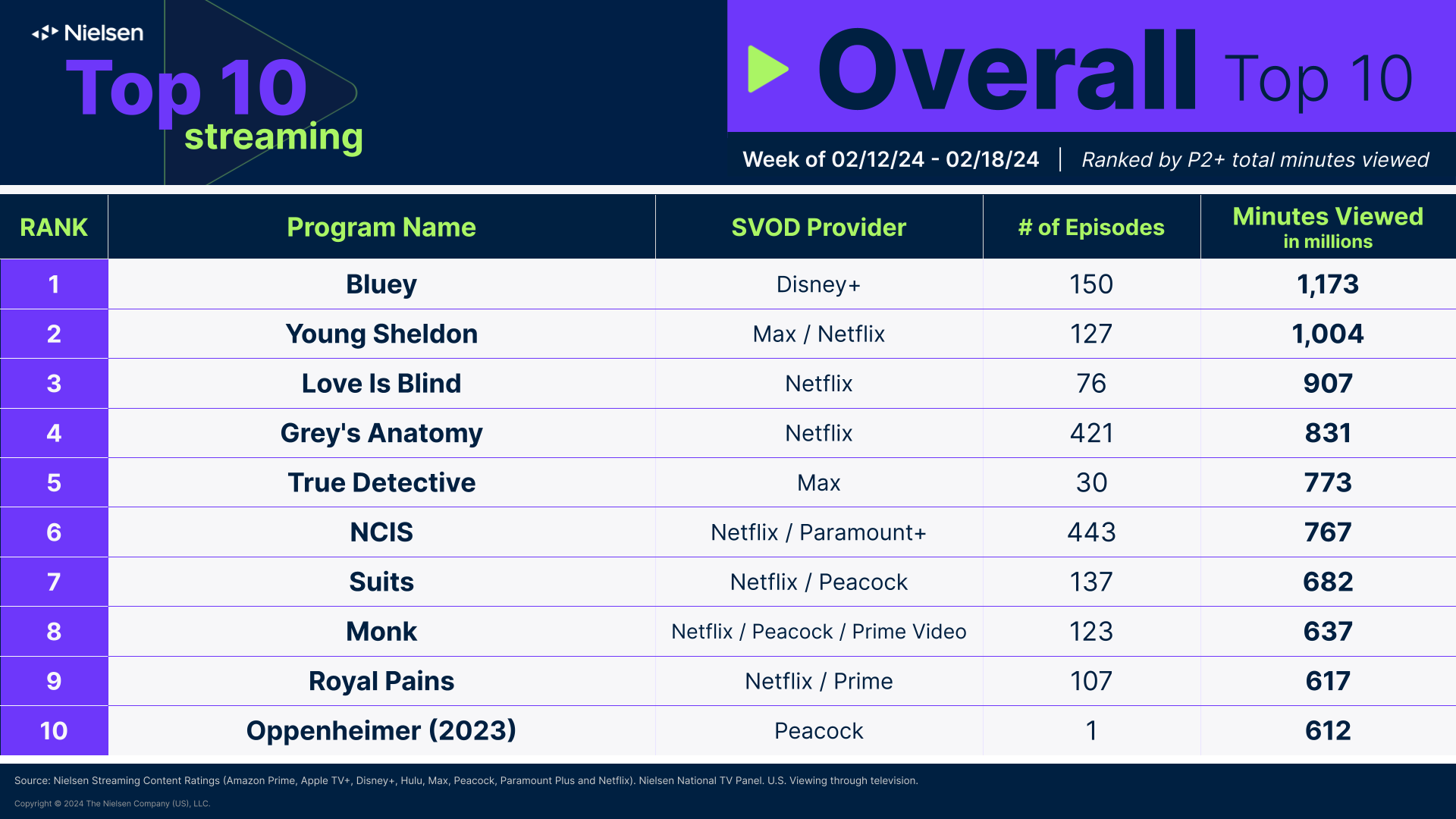 Classic episodes of “Bluey” streaming on Disney+ and “Young Sheldon” on Max/Netflix (at Nos. 1 and 2, respectively, for the week) each generated more than 1 billion weekly minutes consumed through Feb. 18, according to new data from Nielsen.