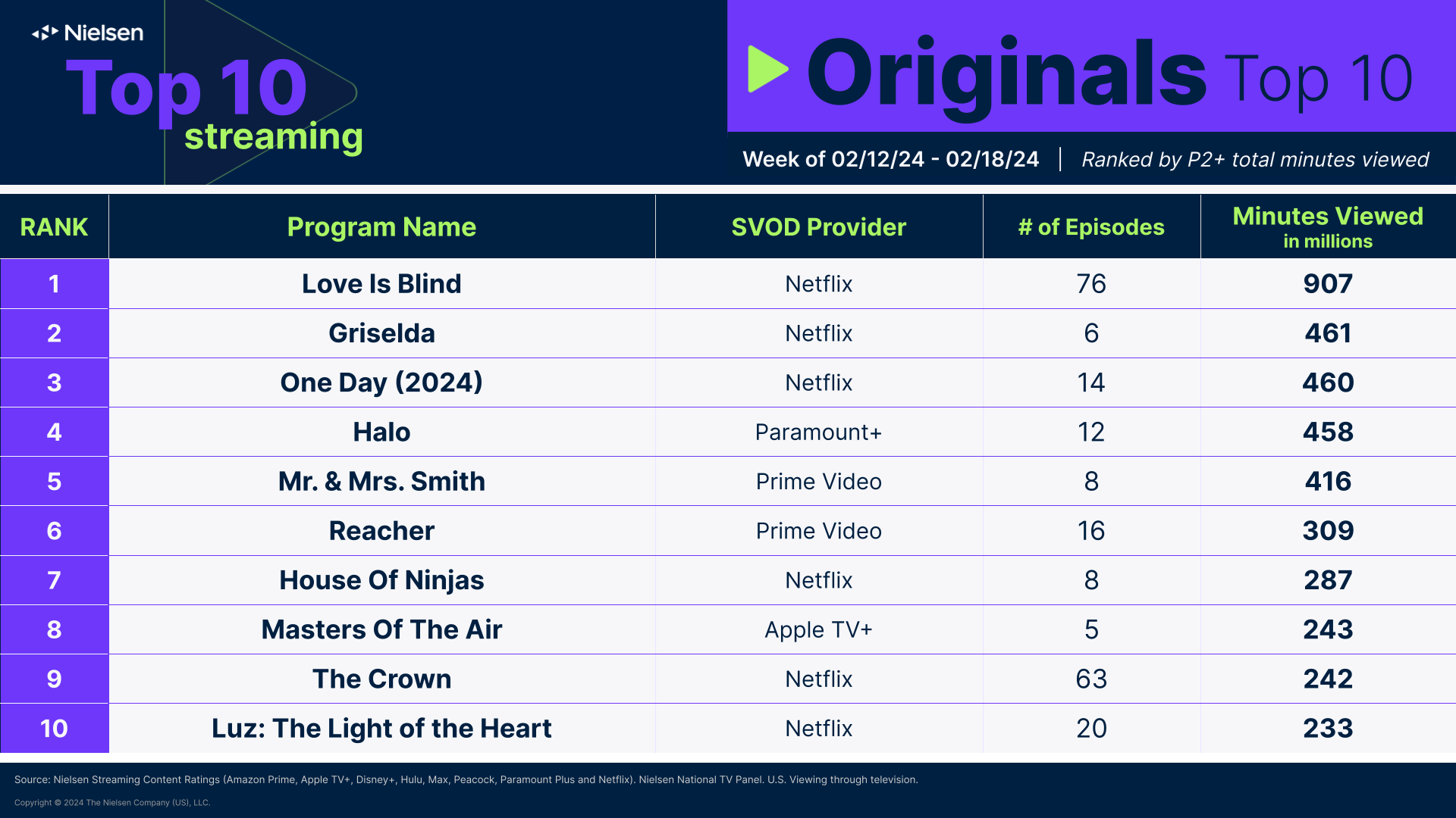 Netflix released the first six episodes of season six of “Love Is Blind” on Valentine’s Day. The series drove 907 million viewing minutes to take No. 3 overall, and No. 1 among original programs. Nielsen said 78% of the reality dating show’s viewers were ages 18-49, and 75% were female.