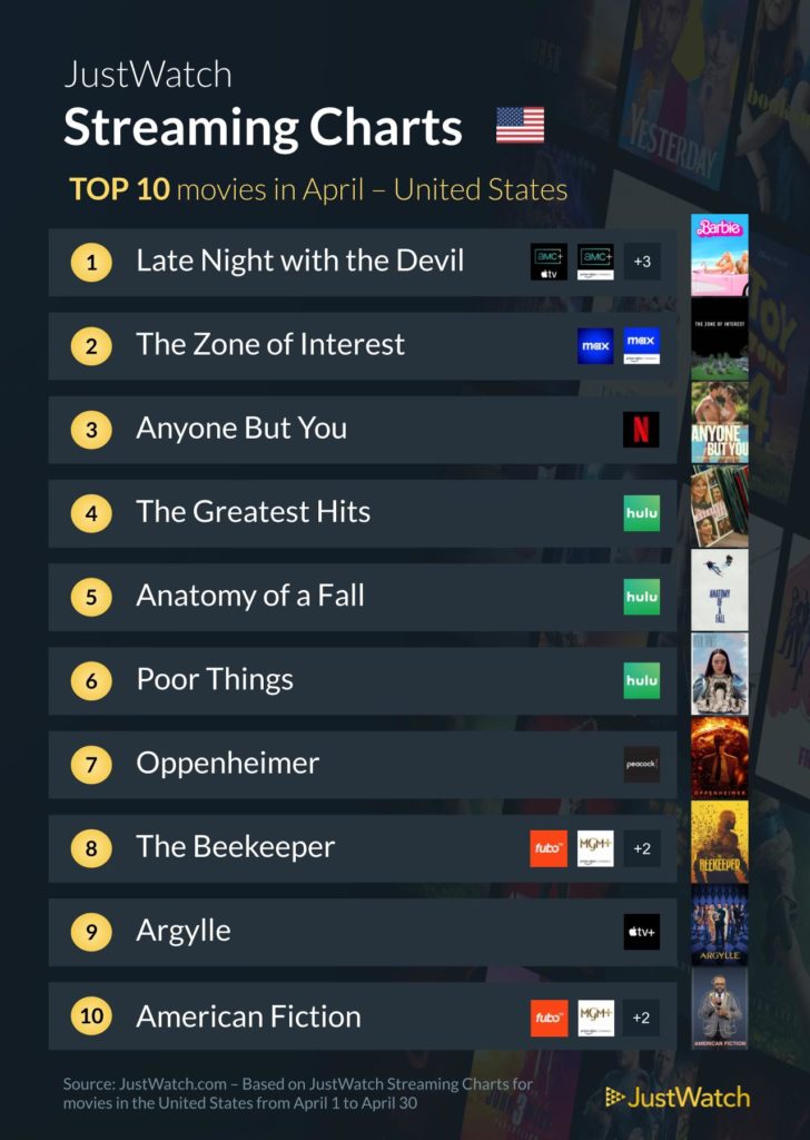 IFC Films’ 2023 indie horror movie Late Night With the Devil topped all streamed movies in April, according to new data from JustWatch.com, which tracks data from more than 20 million users’ monthly digital video choices across 54 countries.