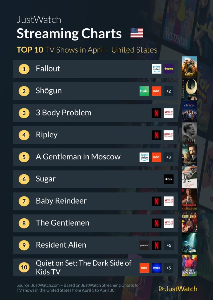 Among episodic content, Prime Video’s original sci-fi dystopian thriller “Fallout” held off Hulu’s historical drama series “Shogun” and Netflix’s Chinese-based limited sci-fi series “3 Body Problem.”