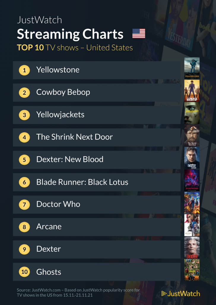 The “Ghostbusters” franchise, old and new, continues to resonate among moviegoers and consumers in the home. The third movie in the franchise, Ghostbusters: Answer the Call, ranked as the most-popular movie streamed through Nov. 21, according to new data from JustWatch. Paramount series “Yellowstone” was the most-streamed TV show during the week.