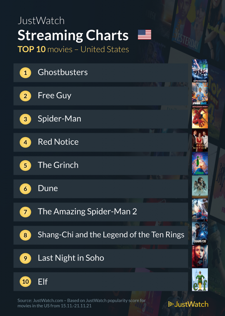 JustWatch tracks more than 20 million users’ monthly streaming decisions across 54 countries. Among the most popular weekly movies were 20th Century Studios’ Free Guy and Sony Pictures’ 2002 release Spider-Man.