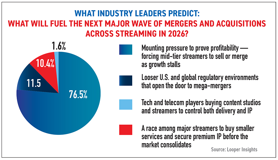 In a search for increased profits, the industry can also expect more consolidation in the coming year, according to industry leaders surveyed by Looper Insights. In the survey, a whopping 76.5% expect that mounting pressure to improve profitability will force mid-tier streamers to sell or merge as growth stalls. That consolidation will mean less new content for consumers.