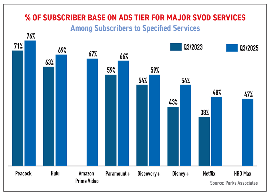 In a 2025 survey of more than 8,000 domestic broadband households, Parks Associates found that consumers’ use of free ad-based services had doubled over the past six years, from 23% in the first quarter of 2023 to 46% in the third quarter of 2025. Nearly two-thirds of respondents in the Parks study said that the fact that FAST/AVOD services were free was their top reason for tuning in.