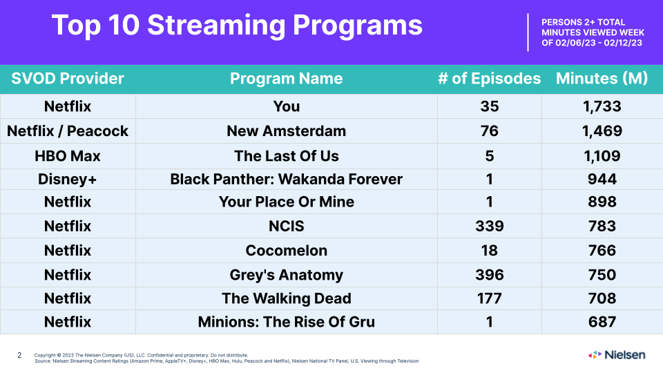Notably, while Netflix again dominated the Nielsen top 10 chart, only two of its eight charting shows and movies were originals.