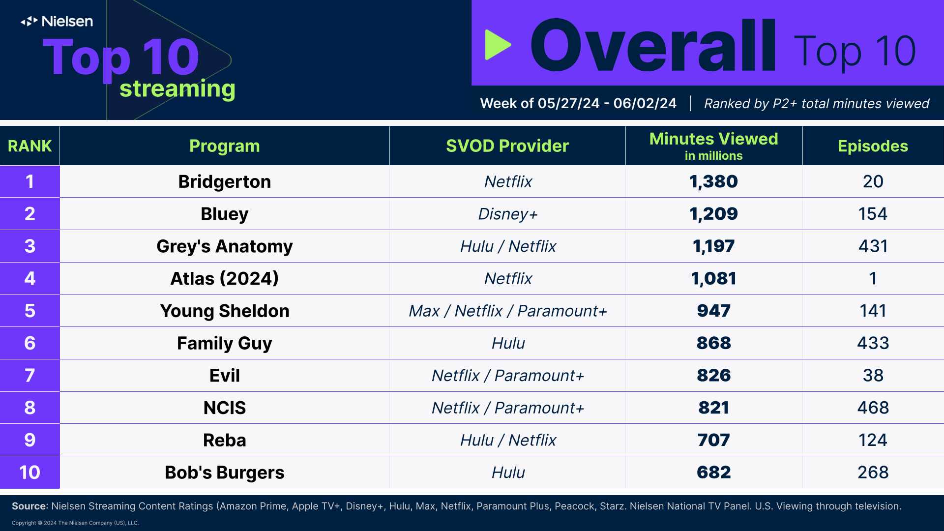 The new season of Netflix’s “Bridgerton” racked up 3.03 billion viewing minutes to rank No. 1 overall. Netflix released the first four episodes of the fourth season on Jan. 29. While the viewing total is based on all available episodes (28), the four new additions contributed 74% of the viewership total. Adult women (18+) were the biggest drivers of viewership, accounting for 72% of total watch time.