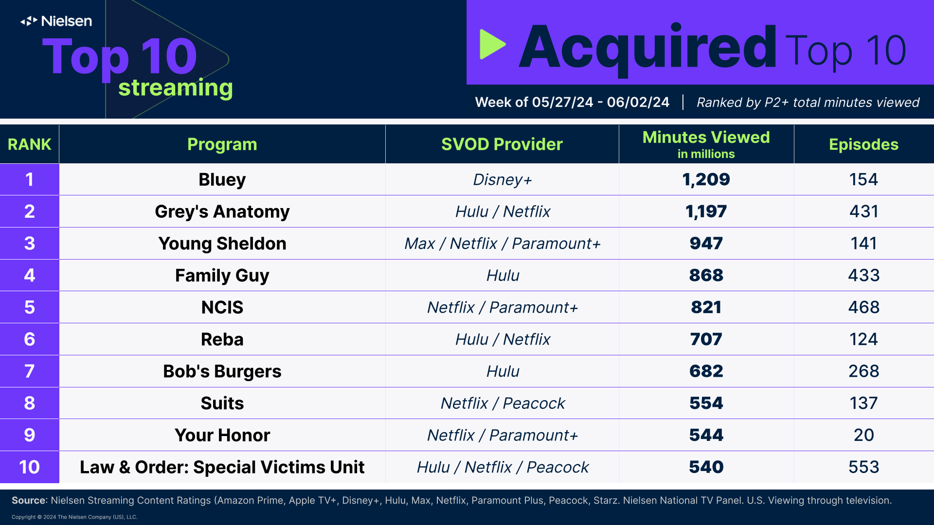 The catalog cop drama “Rizzoli & Isles” generated 1.02 billion minutes to top the acquired chart (No. 6 overall) as the series continues to reap the benefits of streaming on Netflix.