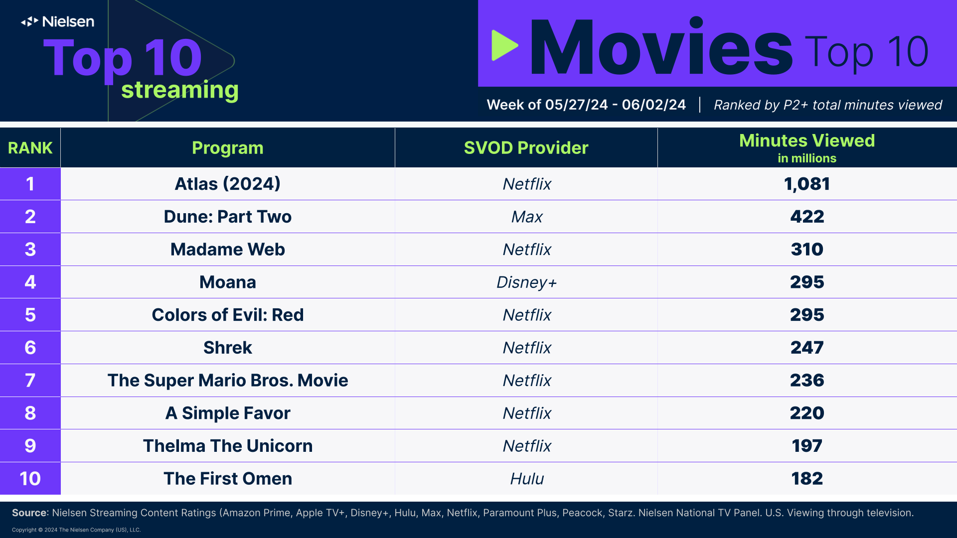 New among top 10 movies was the unrated version of the sci-fi horror film M3GAN 2.0 (483 million minutes, No. 3) on Netflix, and the documentary Secret Mall Apartment (288 million minutes, No. 6), also on Netflix.
