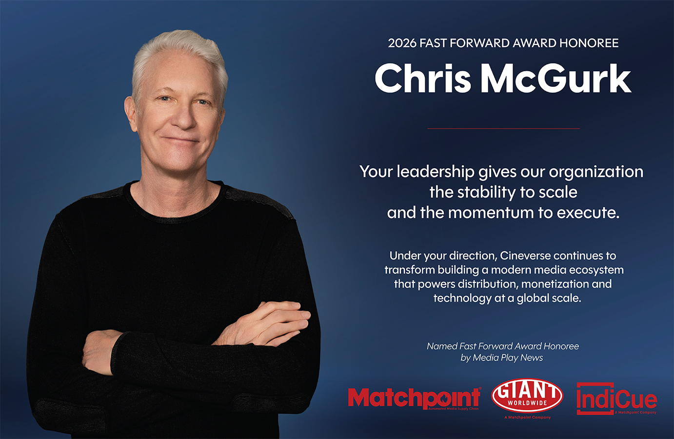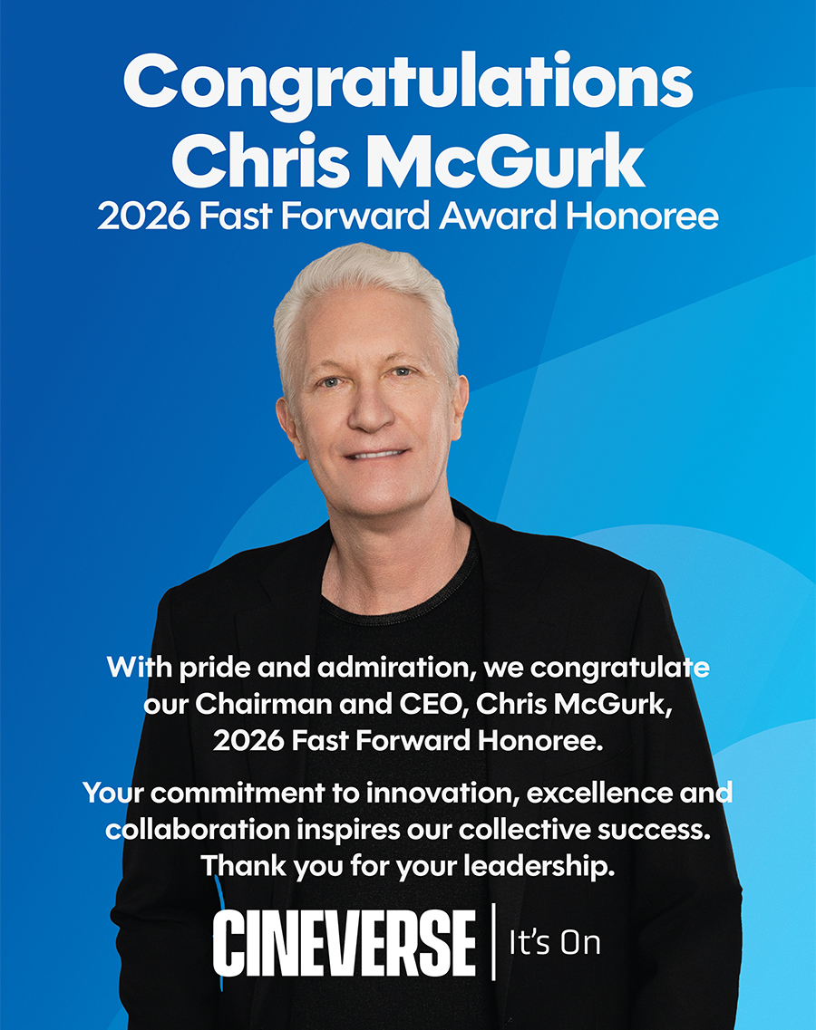 For his belief — which he puts into action — that streaming and theatrical are synergistic rather than cannibalistic, and that technology is the engine that allows our industry’s crown jewel, content, to shine brighter than ever, Chris McGurk is being honored with Media Play News’ 2026 Fast Forward Award. The award is given out each year to a person, technology or organization that moves the home entertainment industry forward.