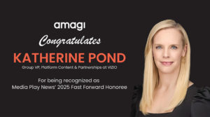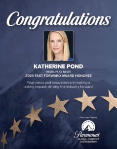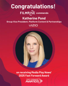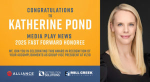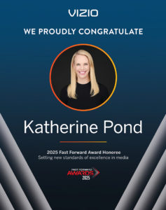 Katherine Pond, Vizio’s Group VP of Platform Content & Partnerships, is the 2025 recipient of Media Play News’ seventh Fast Forward Award, presented each year to people, technologies, organizations, products or services that move the home entertainment industry forward.