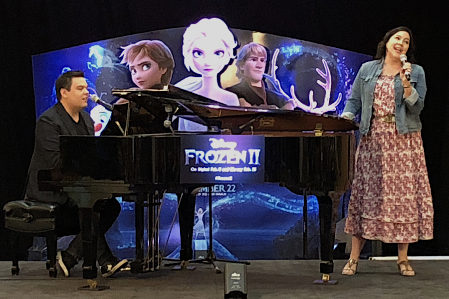 Bobby and Kristen Lopez singing a medley of ‘Frozen II’ songs at the Jan. 28 press day for the film’s home video release.
