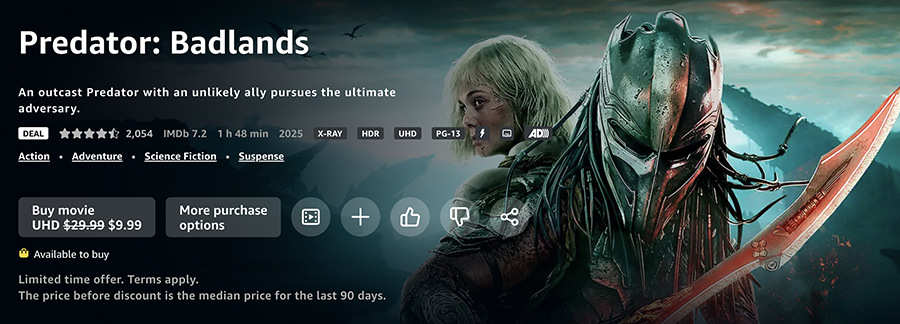 HD formats accounted for 67% of first-week Predator: Badlands unit sales, with 29% from regular Blu-ray Disc and 38% from 4K Ultra HD disc. Thus, it was also No. 1 on the 4K disc sales chart.